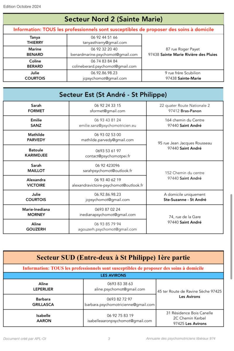 L’APL-OI (Association des Psychomotriciens libéraux de l’Océan Indien) a le plaisir de vous faire parvenir cet annuaire recensant tous les psychomotriciens en libéral de l’île de la Réunion, qui ont bien voulu répondre à l’appel. Cet annuaire date de Avril 2024 et sera réactualisé tous les 6 mois afin de favoriser les échanges entre les psychomotriciens libéraux et leurs partenaires. Pour toute information supplémentaire, changements connus ou remarques diverses, vous pouvez nous contacter via l’adresse suivante: